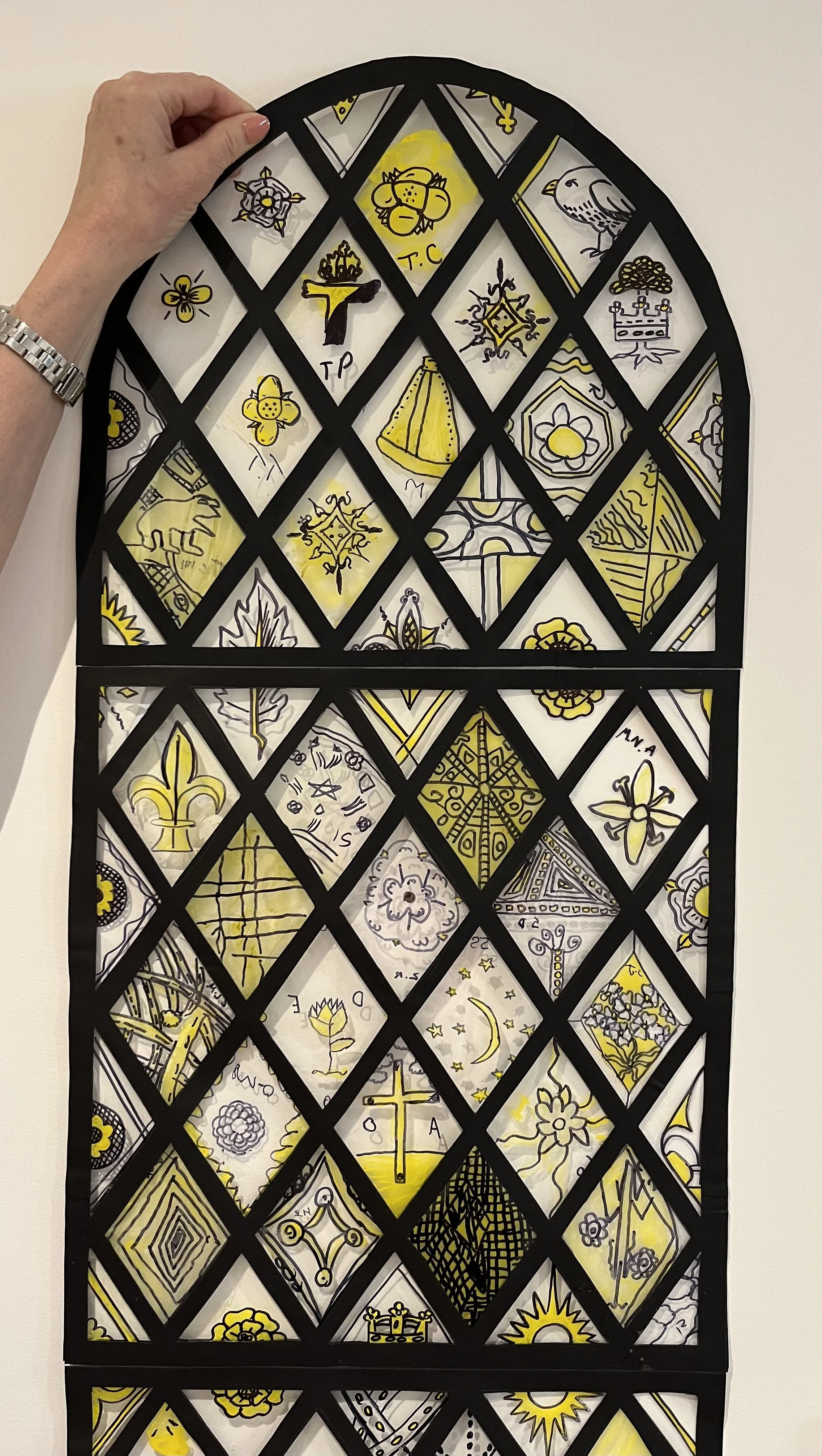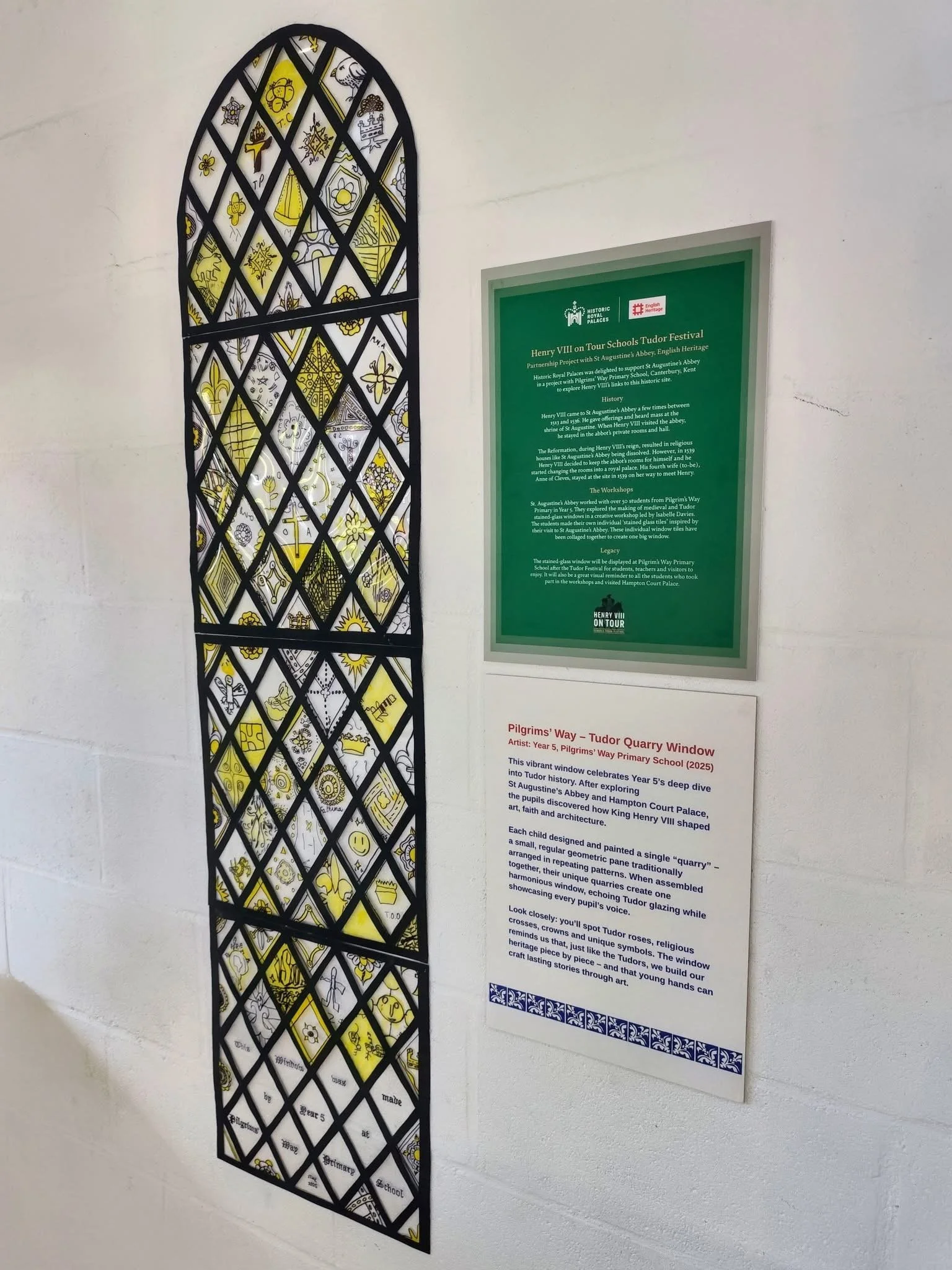 The assembled window of unique designs in a typically Tudor arrangement of repeated geometric diamonds creates a fantastically vibrant, harmonious, and eye-catching work of art by the students. It demonstrates their excitement to engage with the history of Henry VIII at St Augustine’s Abbey and beyond, as well as their enthusiasm for learning about and trying a heritage craft.