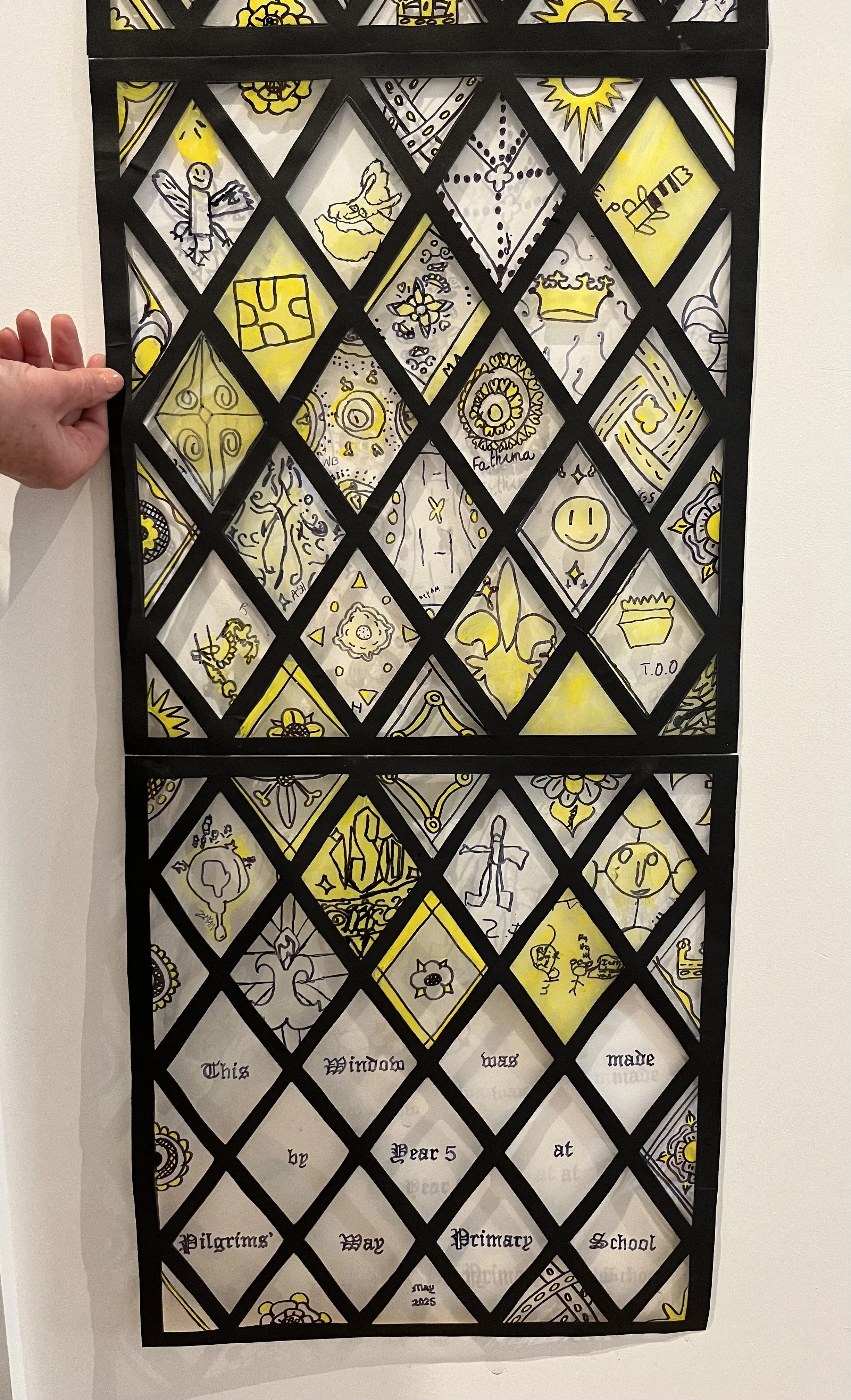 Over 50 students in Year 5 from Pilgrims’ Way Primary school explored medieval glazing in the creative workshop. They heard about the history of stained glass, saw modern tools, and discussed historic examples. The students made their own small Tudor inspired ‘stained glass’ quarry panels using acetate, paper, yellow paint, and pens with designs inspired by their visit to St Augustine’ Abbey and wider learning about how Henry VIII shaped art, faith, and architecture. Each student contributed one quarry that was collaged together to make one big window. The students worked as a team to create their very own medieval glazing studio!